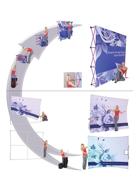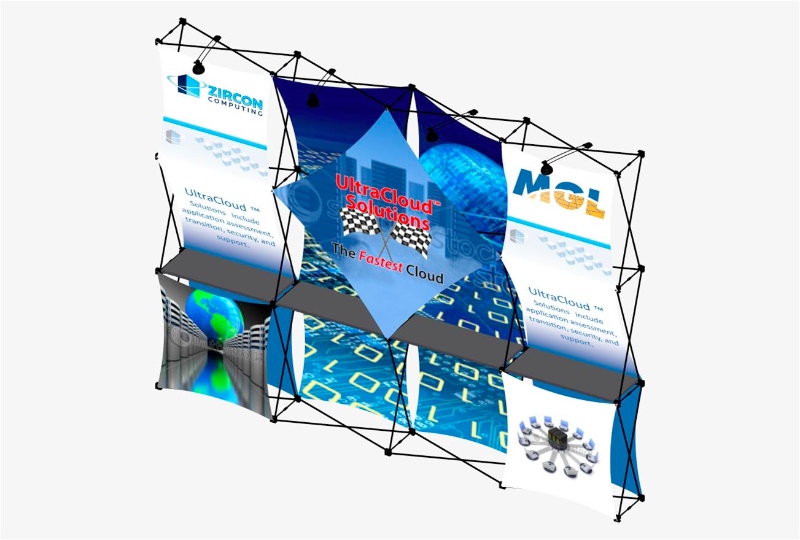 Used in a linier configuration, portable displays are usually 8' or 10' wide x 8' high and can be creatively customized to differentiate you from other exhibitors through graphic treatments and accessories. If you have a longer linier space to fill, you can string together multiple linier displays to provide a seamless back wall display with plenty of room for graphic design. Lightweight and easy to install without tools, portable displays are the most popular displays used in tradeshow marketing.